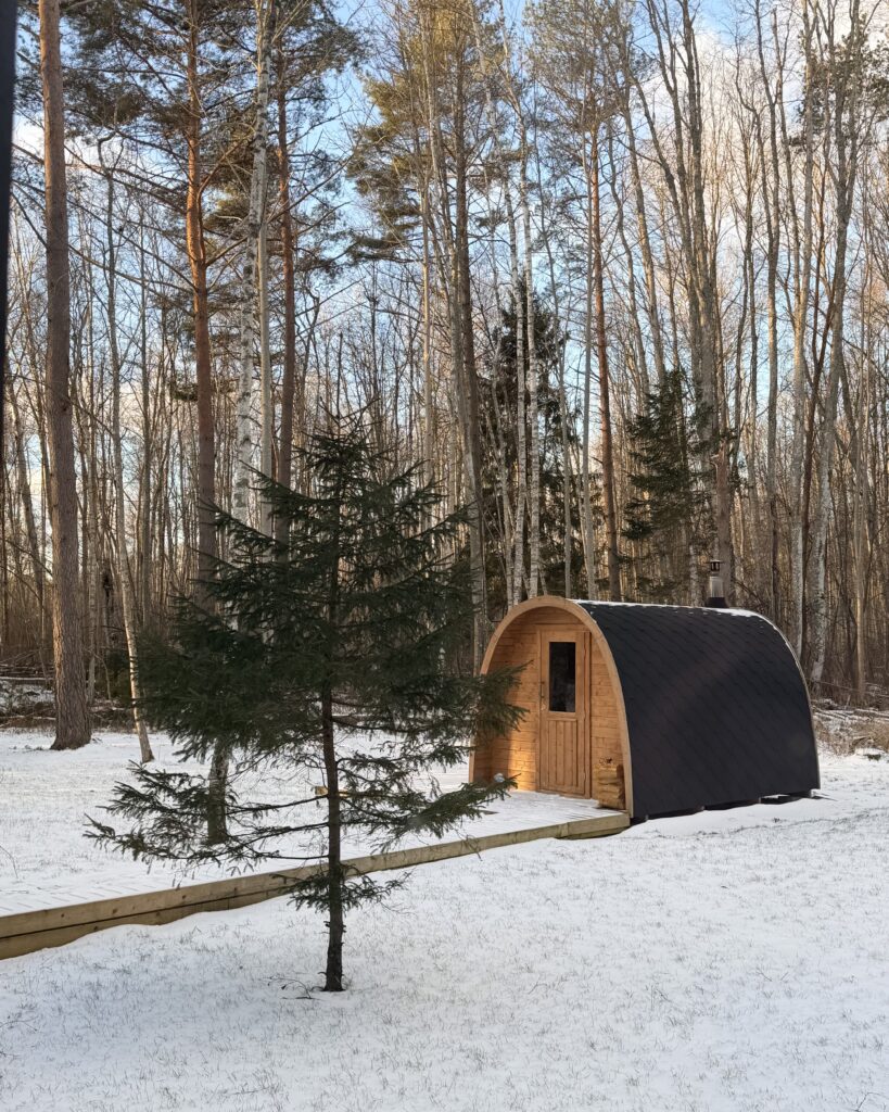 Luksuslik saunaelamus: traditsiooniline puuküttega saun ja väliõues asuv tünnisaun. Mõlemad saunad kuuluvad hinna sisse.